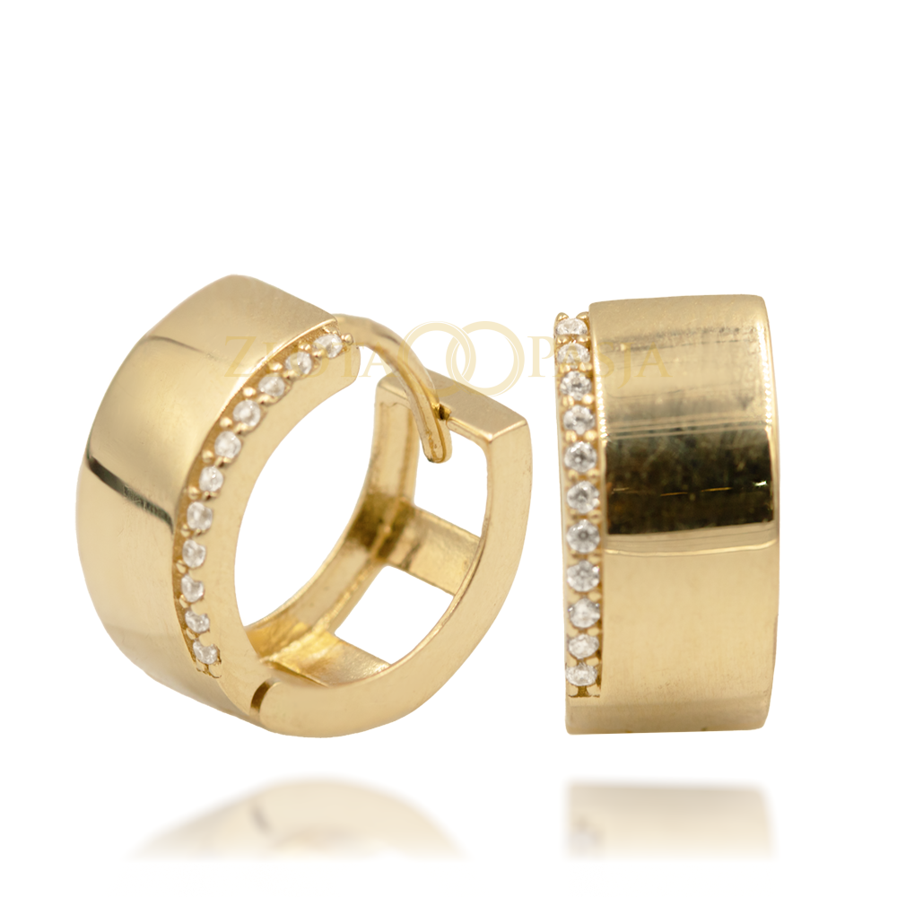 Grube, geometryczne koła w ciepłym odcieniu złota, z delikatną listwą białych cyrkonii kontrastującą z gładką powierzchnią, idealne do wieczorowych stylizacji.