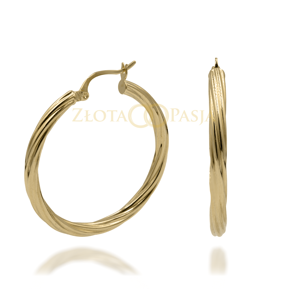 Okrągłe kolczyki z delikatnym, spiralnie skręconym wzorem na całej powierzchni, który nadaje im efekt subtelnej faktury i lekki ruch.