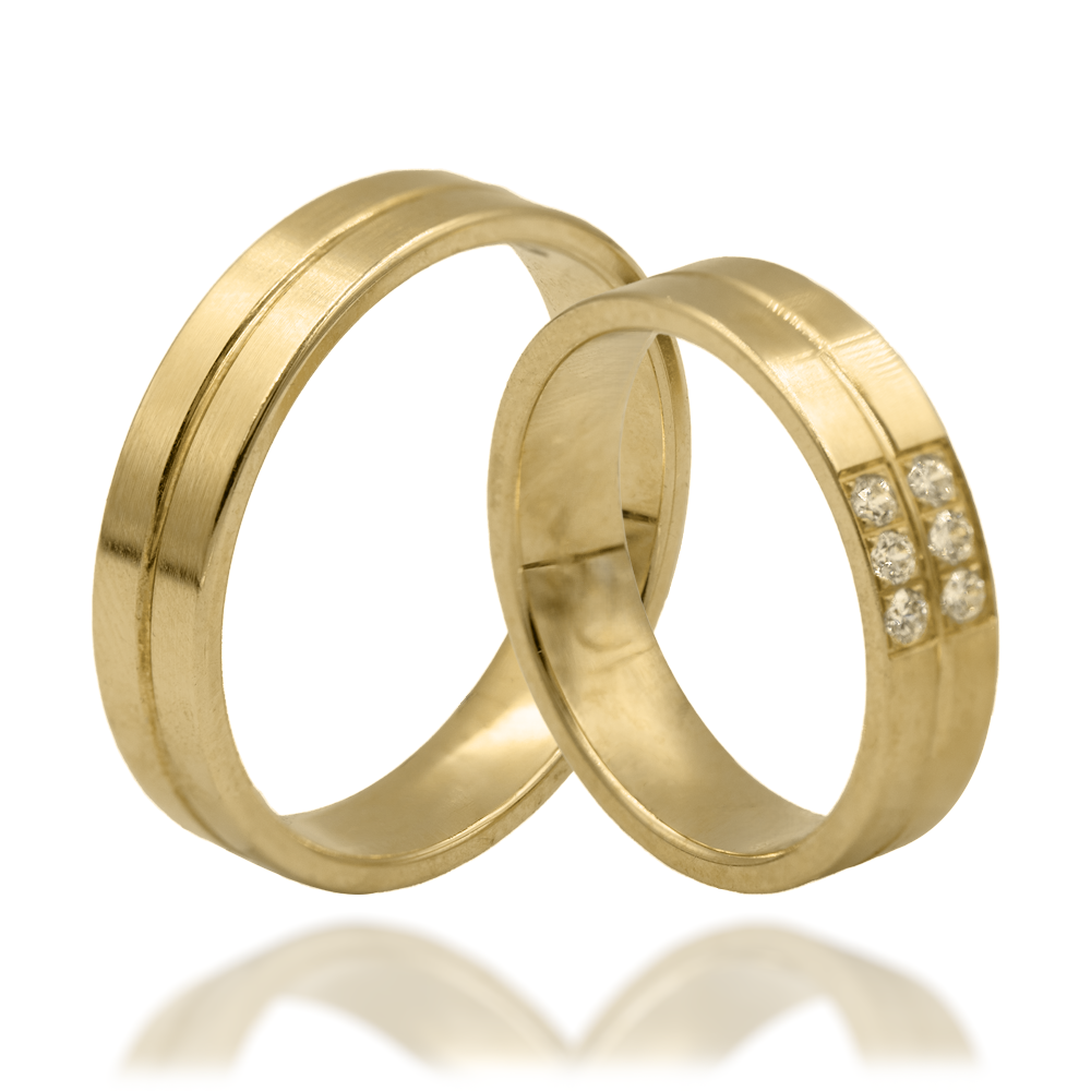 Delikatne obrączki z minimalistycznym zdobieniem, gdzie męska wersja zachwyca prostotą, a damska olśniewa subtelnym błyskiem sześciu kamieni – idealne dla par ceniących równowagę i elegancję.