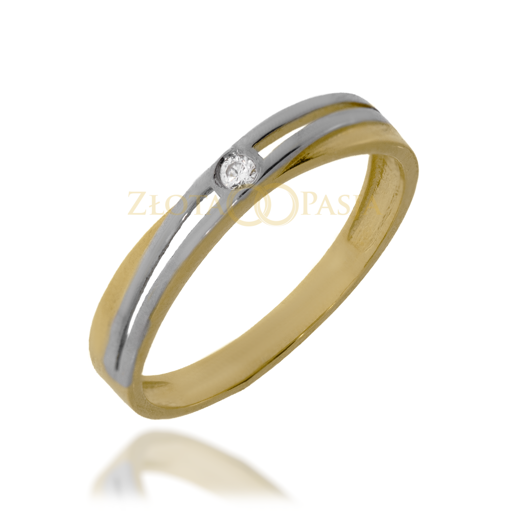 Smukła żółto-biała szyna z wcięciem pośrodku. Okrągła cyrkonia osadzona centralnie w gładkiej, niskiej oprawie.