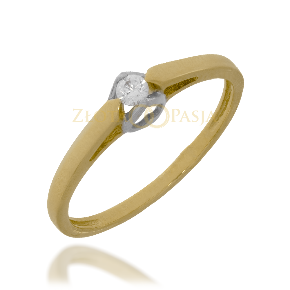 Żółte złoto połączone z białą główką; rozwidlone boki subtelnie eksponują centralny kamień.