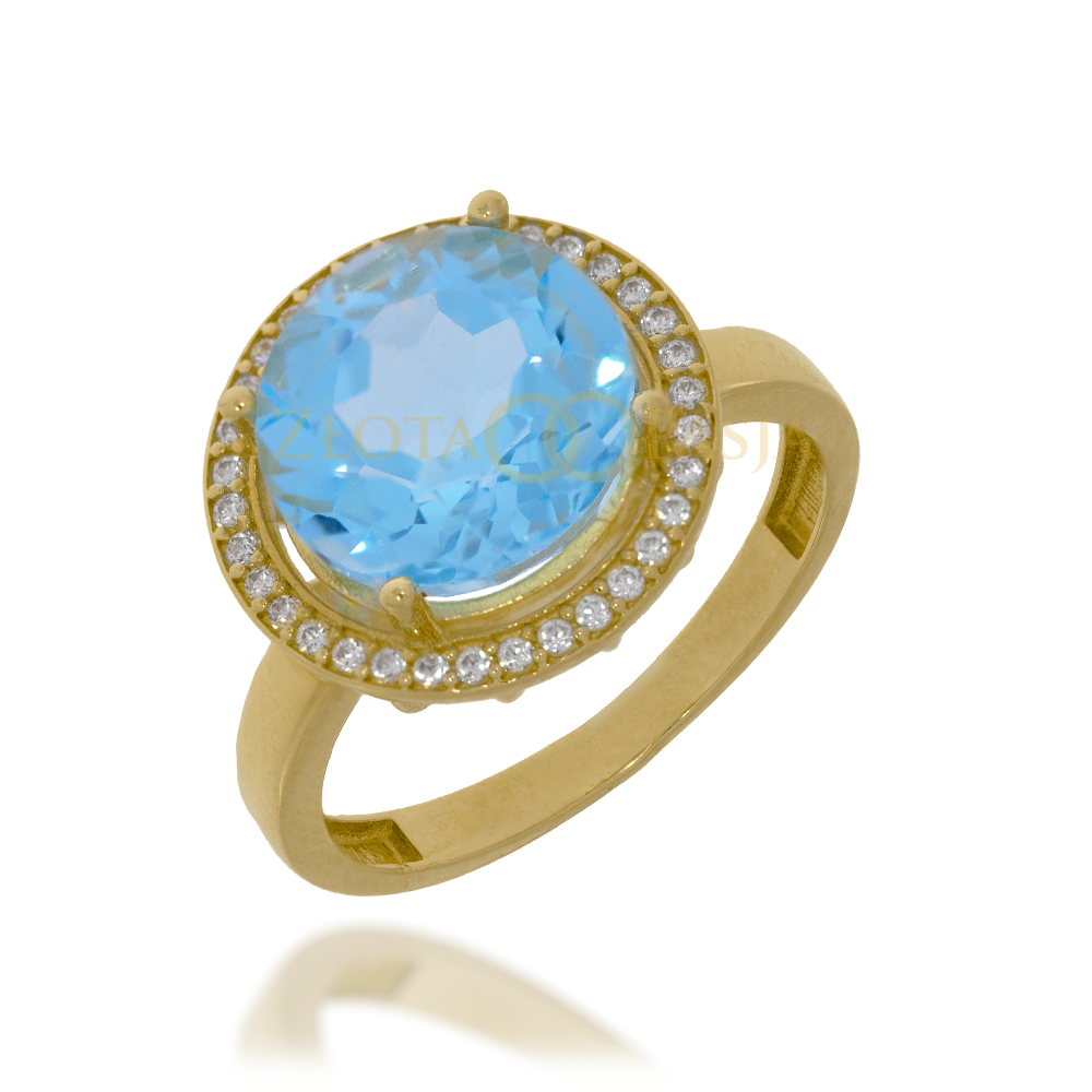 Centralny, duży kamień w kolorze błękitu, dookoła pełna obręcz z drobnych cyrkonii, smukła, gładka szyna.