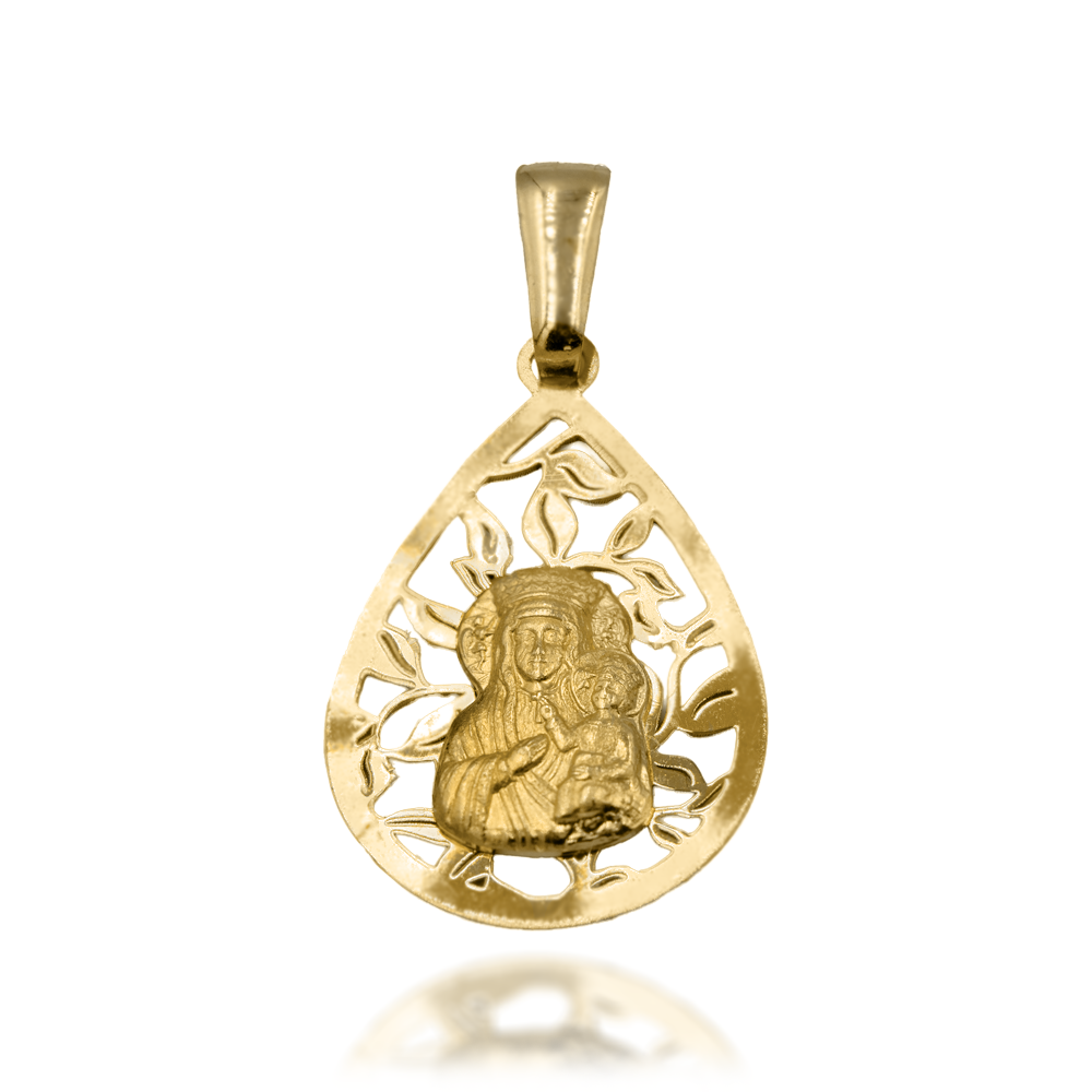 Medalik w kształcie łezki z ażurową ramką o roślinnym motywie. W centrum wypukły wizerunek Matki Boskiej z Dzieciątkiem, delikatnie satynowany, otoczony gładko polerowanym złotem