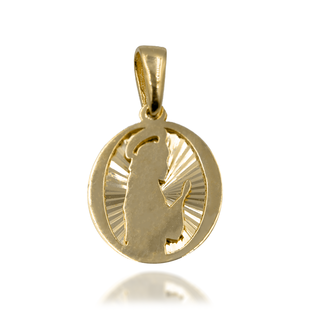 Klasyczny złoty medalik przedstawiający sylwetkę Jezusa w okrągłej ramce z promienistym tłem. Subtelny, elegancki symbol wiary i oddania.