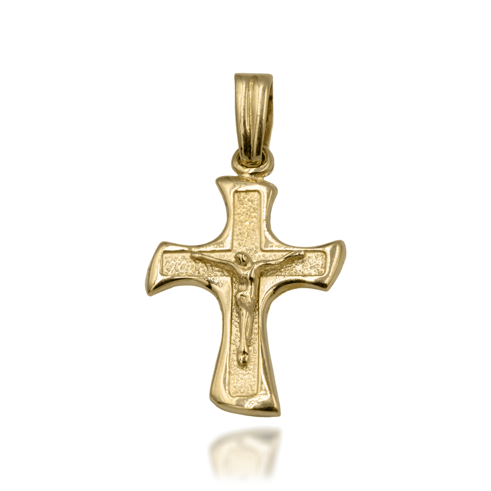 Krzyż o lekko rozszerzanych, miękko zaokrąglonych ramionach. Wypukła postać Jezusa na ziarnistym, matowym tle; krawędzie gładko polerowane, krawatka z delikatnymi żłobieniami.