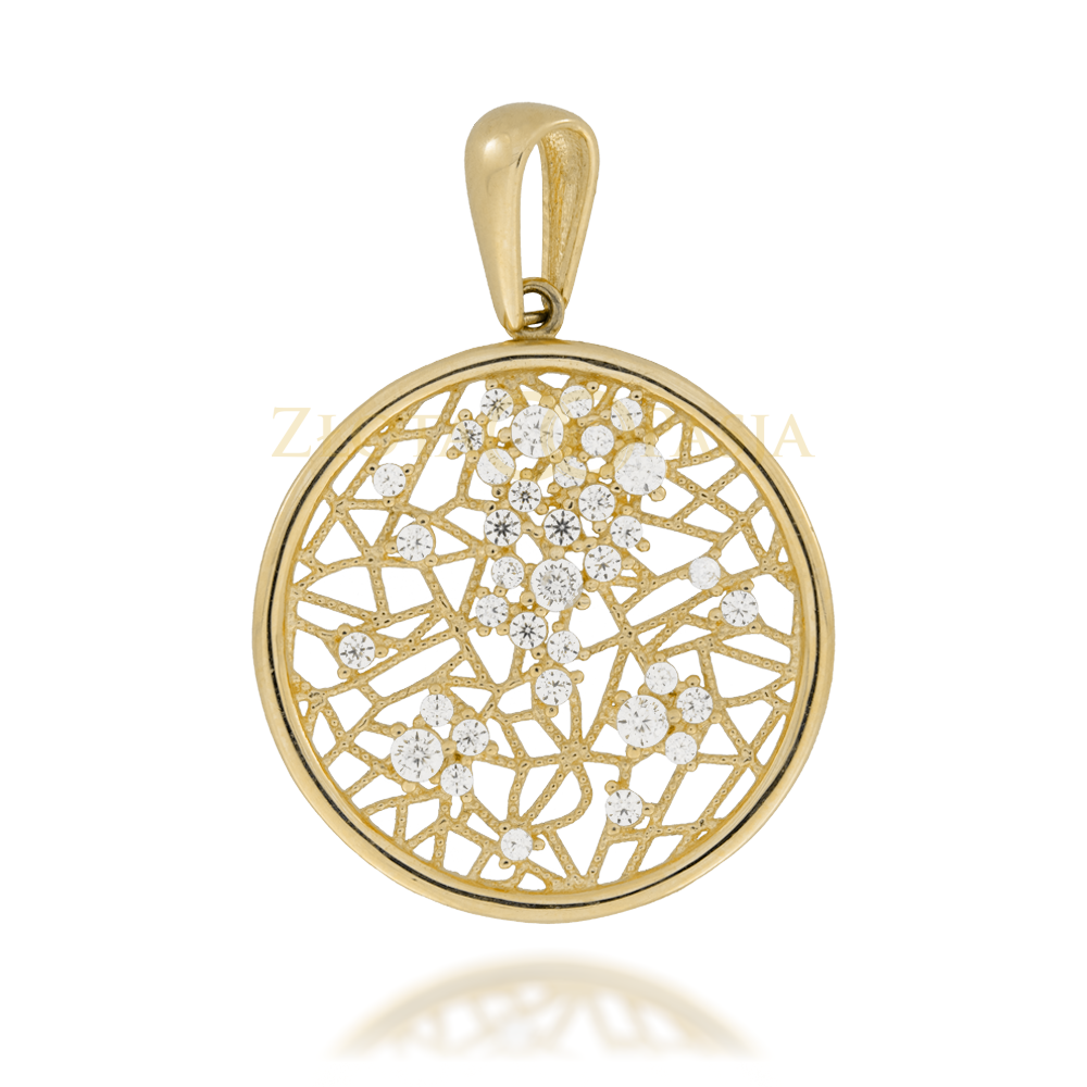 Zawieszka Złota Ażurowa Okrągła Zdobiona Cyrkoniami o Różnych Rozmiarach Rozmieszczonych Nieregularnie