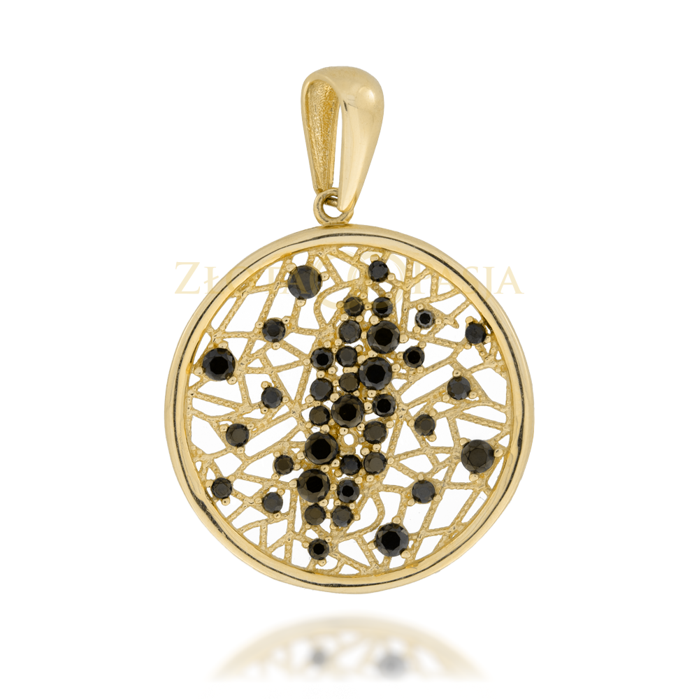 ilość Zawieszka Złota Ażurowa Okrągła Wysadzana Czarnymi Cyrkoniami o Różnej Wielkości Tworzącymi Nieregularny Wzór